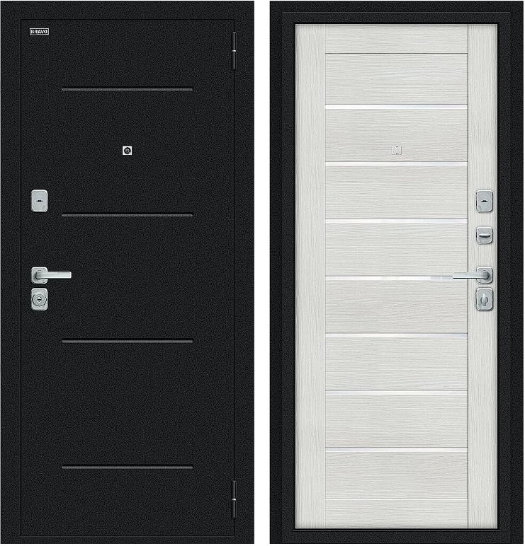 Надежная входная Дверь Браво Техно/BChrome Букле черное/Bianco Melinga премиум класса по цене 33 387 руб. Большая толщина стали защитит от проникновения в ваш дом, квартиру или коттедж. Используется очень качественная фурнитура: замки, цилиндры, ручки, защелки. Покрытие и отделка двери изготовлено под внимательным контролем производителя. Дверь имеет долгий срок службы и гарантию.